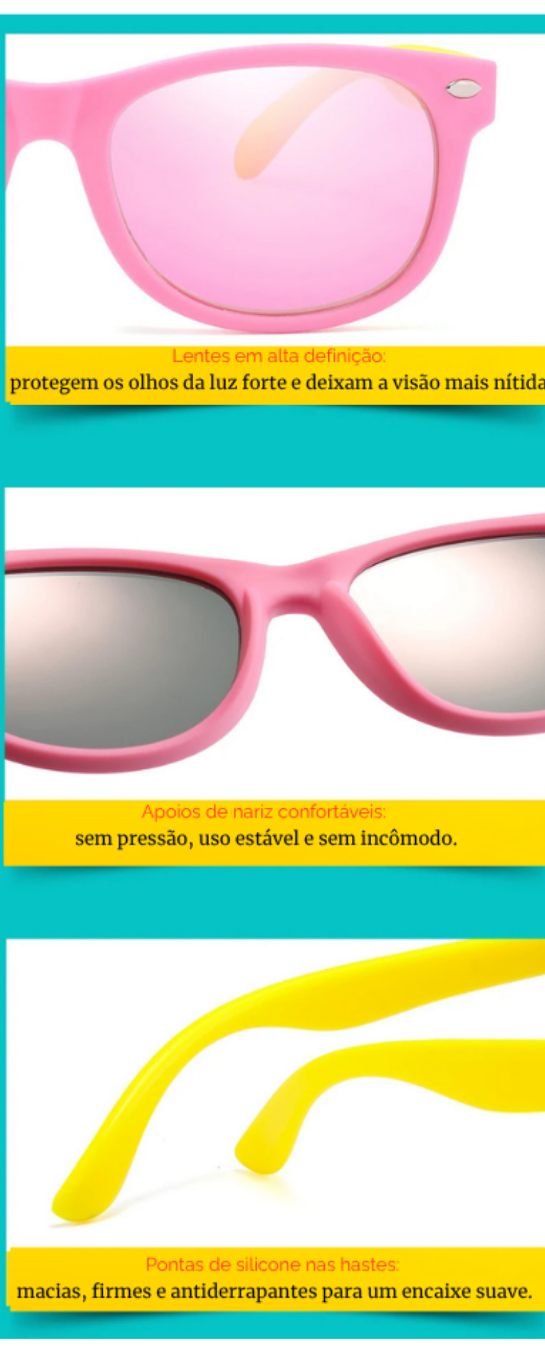Com armação em silicone superflexível e lentes com proteção UV400, eles garantem conforto e segurança para os pequenos em qualquer ocasião.